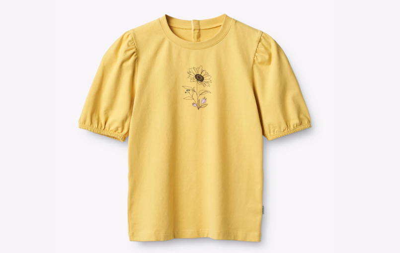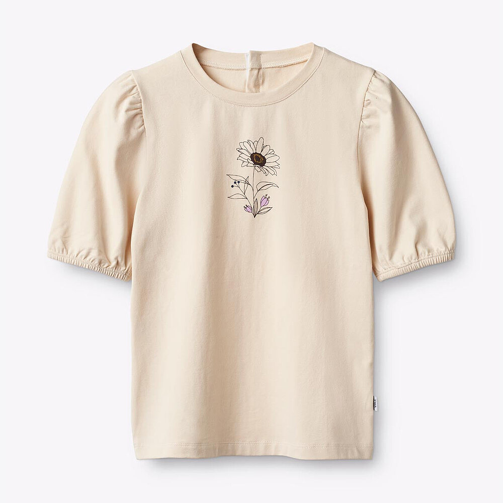 ABELLIN is an airy T-shirt for girls made from soft organic cotton, ideal for warm days. Available in two vibrant colors, it features a beautiful wildflower print and sparkling details that make it extra special.