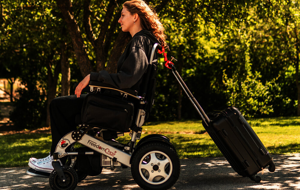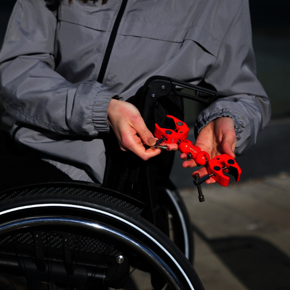 Arnie, the towbar for on the go: wheelie suitcases, trolleys or shopping carts can be effortlessly attached to the wheelchair.