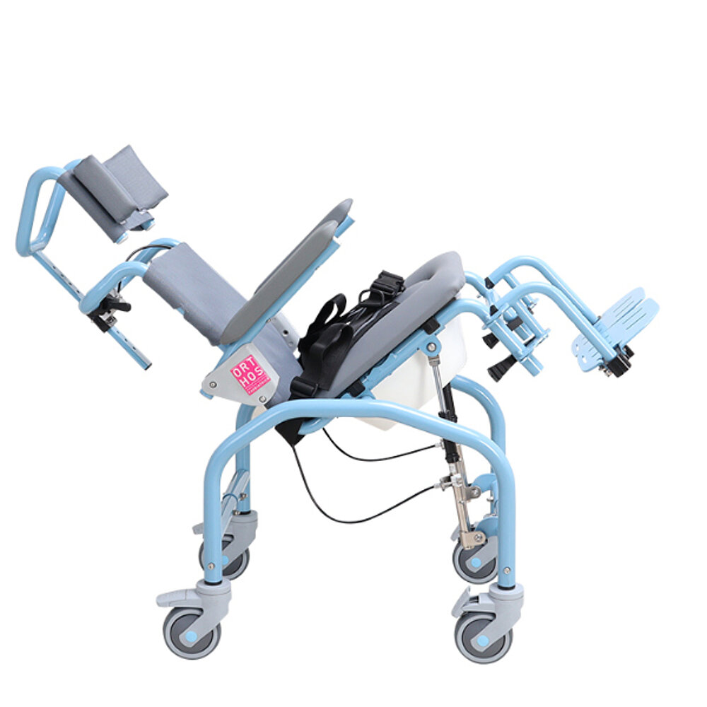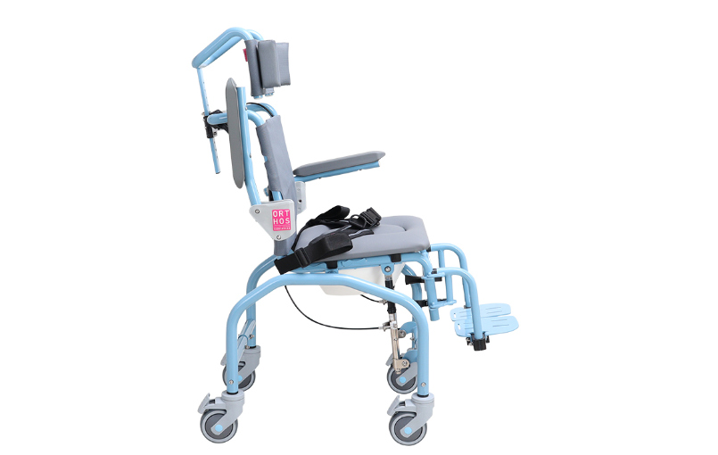 The stainless steel shower and toilet chair is ideal for children with motor impairments. It offers a tilt range of 5º to 40º, with adjustable headrest and padded wedges, waterproof cover and an elastic seat with opening and cover. Features include a 2-point lap belt and a 100 mm height-adjustable frame. The chair is available in sizes 31, 34 and 37 and has folding armrests and footrests that are also adjustable. It is also equipped with 100 mm wheels with brakes and is made of materials that are resistant to cleaning and disinfection.