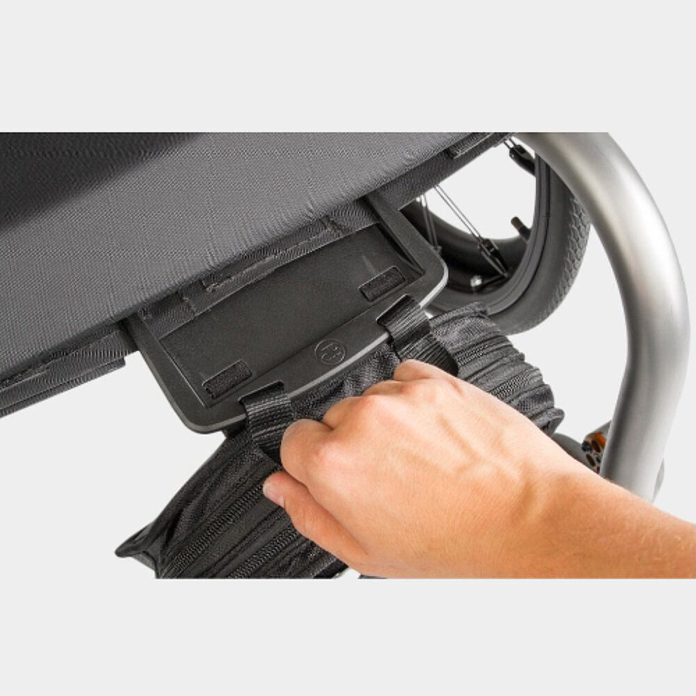 Effortless attachment and removal of the wheelchair bag to the front or side of the wheelchair.