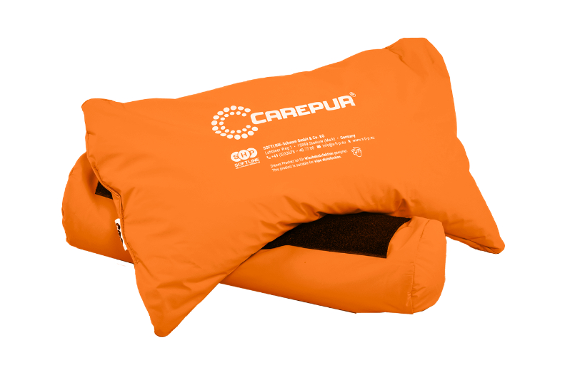 The CAREPUR hemiparetic arm cushion is a two-part cushion that can be used on both sides for soft positioning and stabilization of a hemiparetic arm when seated, especially in a wheelchair. It consists of a cylindrical cushion base and a rectangular arm support, which are attached to each other with Velcro. The cushion relieves pressure on the forearm, stabilizes the position and reduces tensile forces in the shoulder joint.