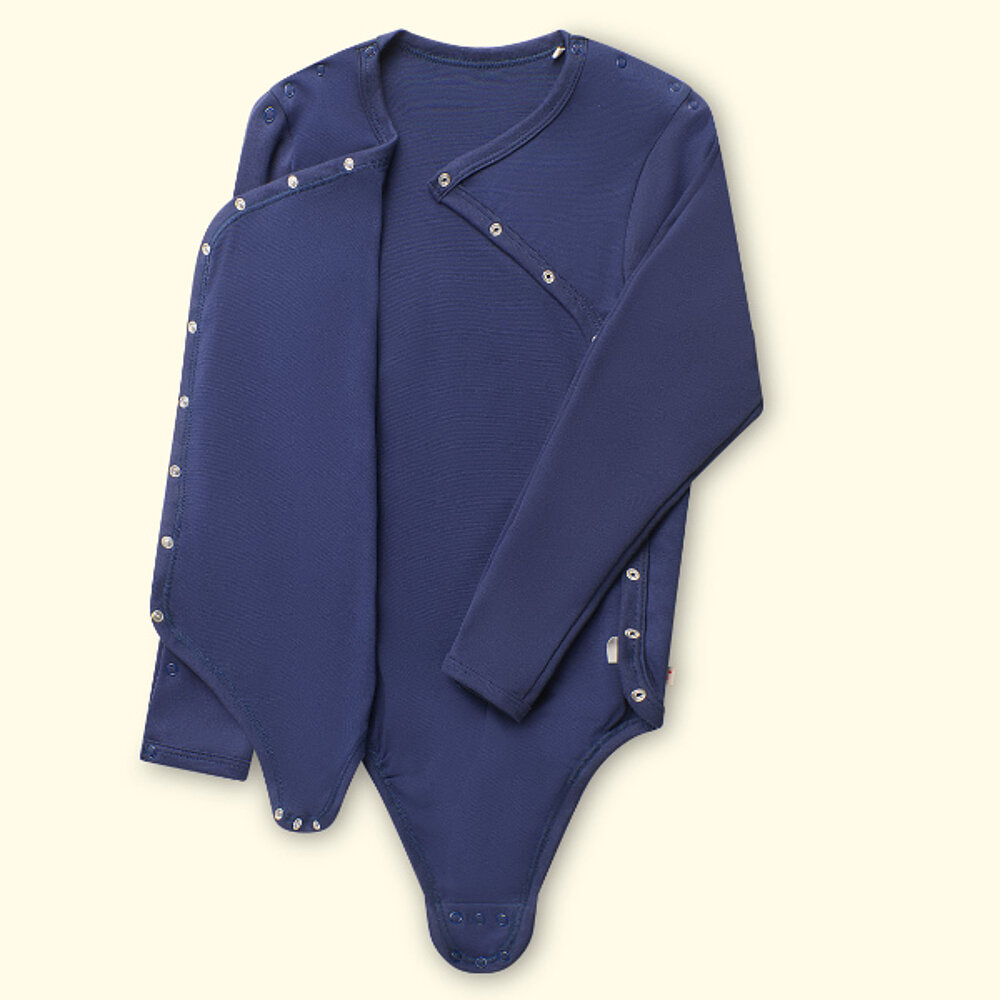 The adaptive tube body Large Charlotte 2.0 facilitates the care of all medical accesses and ensures maximum comfort. With an optimized cut, improved fit and grow-with-you function, it offers a comfortable solution for premature babies, children with feeding tubes, catheters or plaster casts and after operations. The bodysuit is made from soft organic cotton, is easy to put on and take off and is available in petrol and navy. Produced fairly in Europe, it offers high quality and durability.