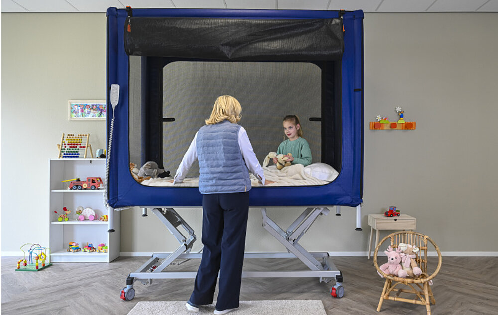 Thanks to its large lying surface (200 × 90 cm), height-adjustable slatted frame, reinforced safety nets, low access and opening on both sides, COCOON offers optimum conditions for care, therapy and everyday life. The compact design fits through standard doors, is easy to clean, waterproof (IPX6) and can be individually colored - for more safety, participation and quality of life in everyday family life.