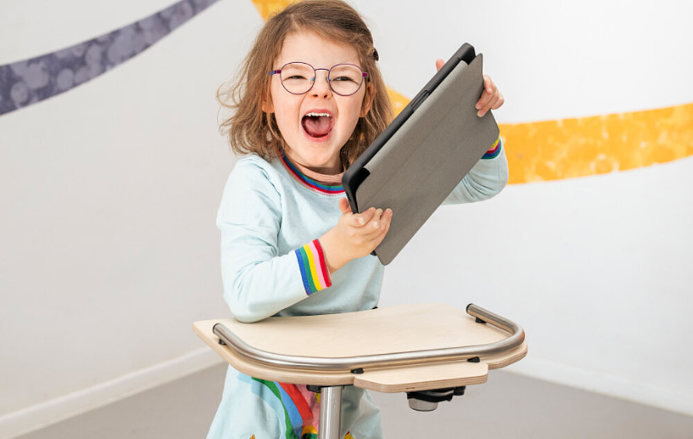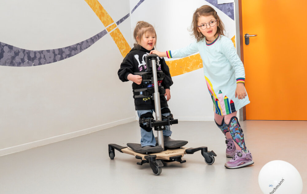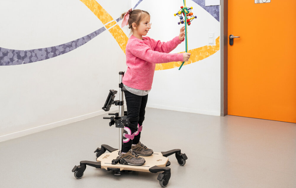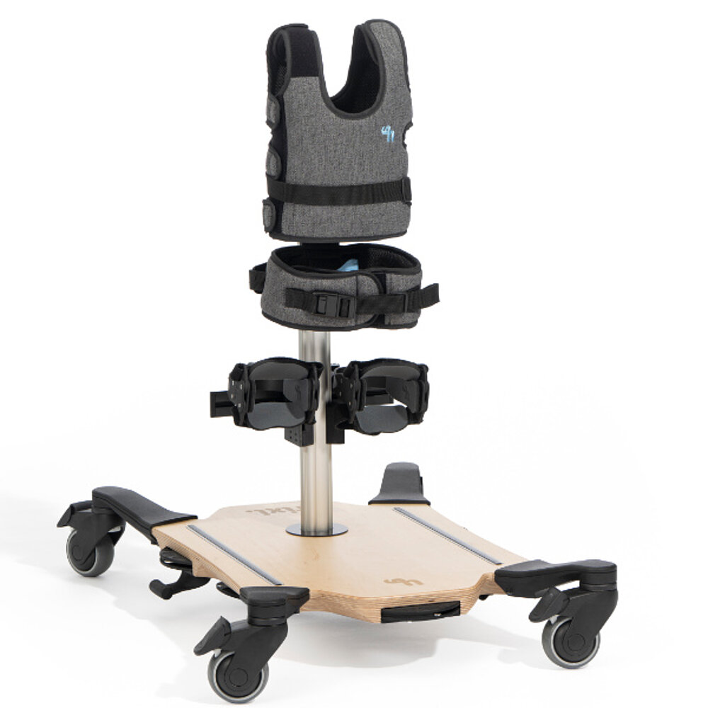 The stixi. App playfully provides more fun and motivation when standing by recording standing times and displaying progress in a success curve. The basic model is available in a dynamic or rigid version as required and can be fitted with a vest and pelvic and chest supports for additional support. Three-dimensionally adjustable knee supports provide a large, pressure-reducing support surface in any position and, together with the pelvic support, ensure a secure feeling. Castors with total locking allow safe entry and exit, as they prevent unintentional rolling away. A therapy table opens up a wide range of therapeutic and playful uses, while heel edges provide additional support from behind.