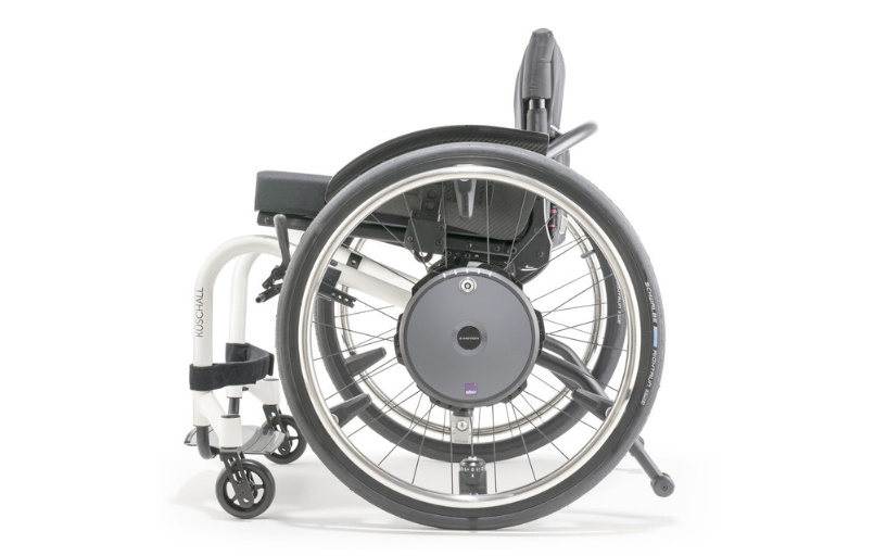 The e-motion push rim drive offers wheelchair users powerful support, combining active mobility with therapeutic benefits. Thanks to the integrated electric motors in the wheel hubs, even individuals with limited strength can move independently. This reduces the amount of force needed to cover longer distances or tackle inclines, significantly expanding the user's range of motion.