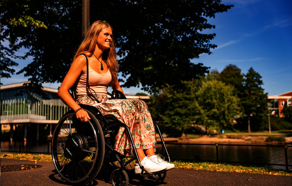 E-Move is an electric push rim drive for manual wheelchairs that powerfully supports the pushing movement and reduces the strain on muscles and joints. Wheelchair users can therefore cover longer distances effortlessly and enjoy greater freedom and mobility.