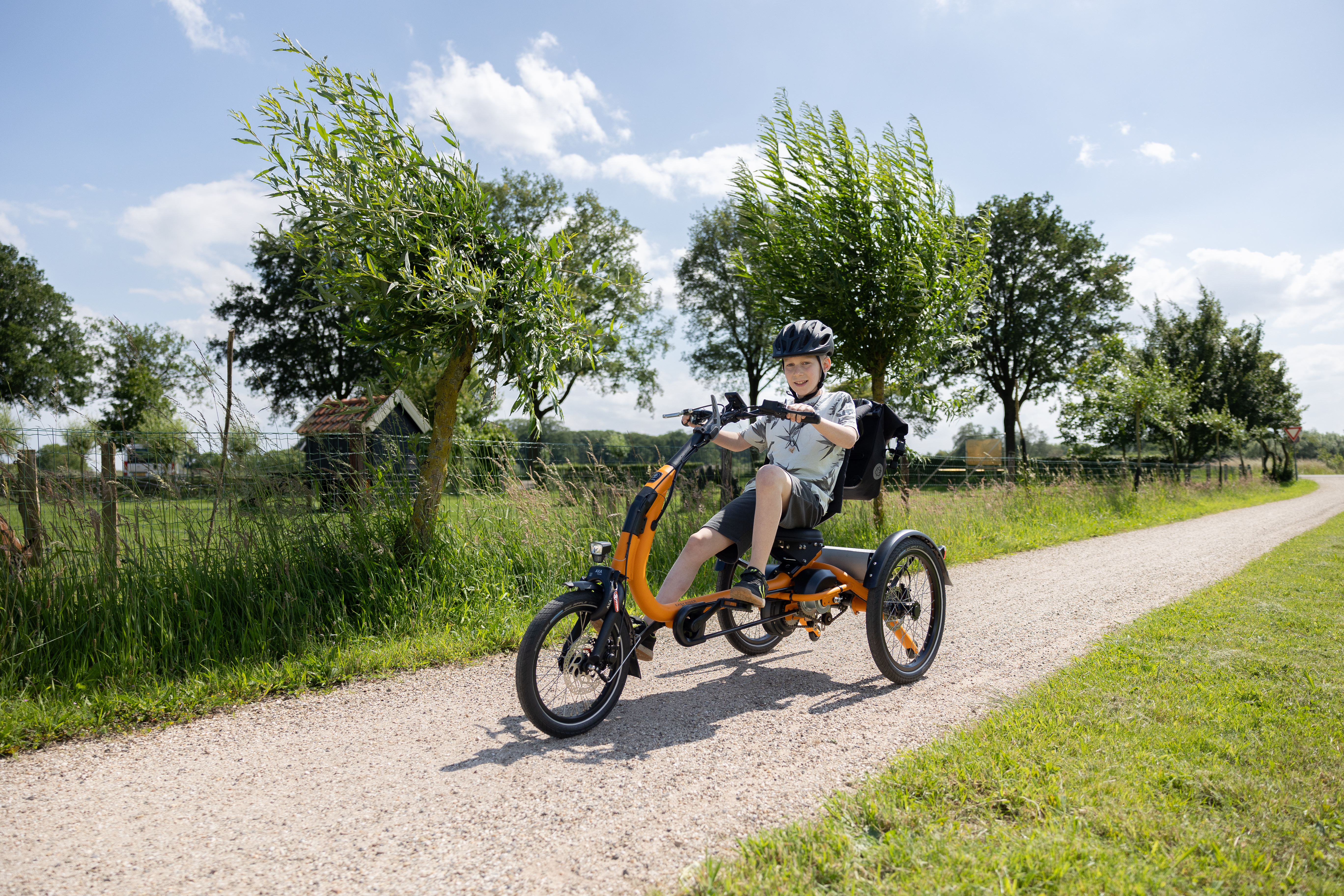 The Easy Rider Compact Small is a comfortable tricycle specially designed for children who need extra stability. With its low entry, seat and backrest, it offers more support than a conventional bike. The forward pedaling motion gives the bike a sporty character. Direction indicators, armrests, foot fixation and electric pedal assistance are available as options. With the Smart E-Bike function, the vanRaam app can be used to set various assistance programs. For safety reasons, the maximum speed is limited to 15 km/h.