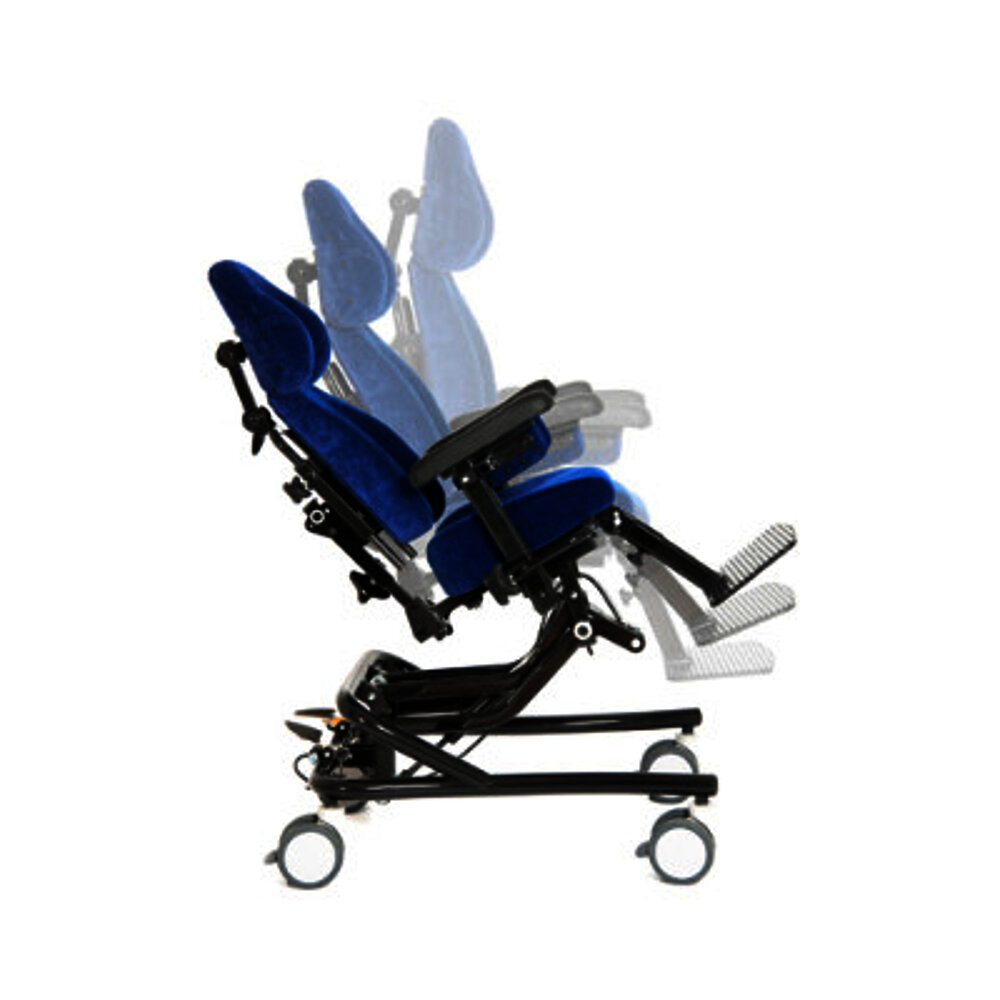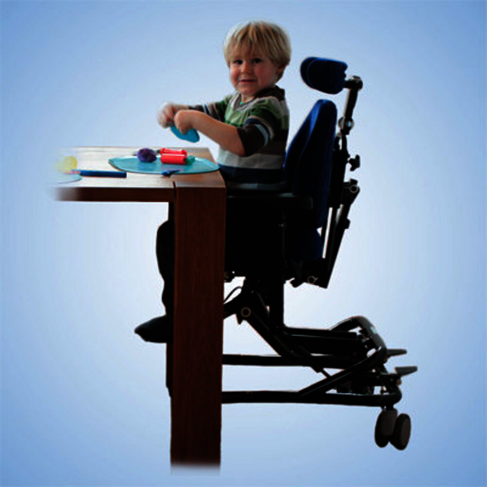 The EVI is a customized children's chair. The EVI chair provides additional support, allowing a child to sit longer and more independently. The chair is easily adjustable in height, ranging from ground level to table height. The standard height adjustment is facilitated by a gas spring. The chair can be adjusted in height while the child is seated. Thanks to the smooth-rolling wheels, the chair is easily movable with the child in it. The chair is equipped with 4 independently lockable wheels.