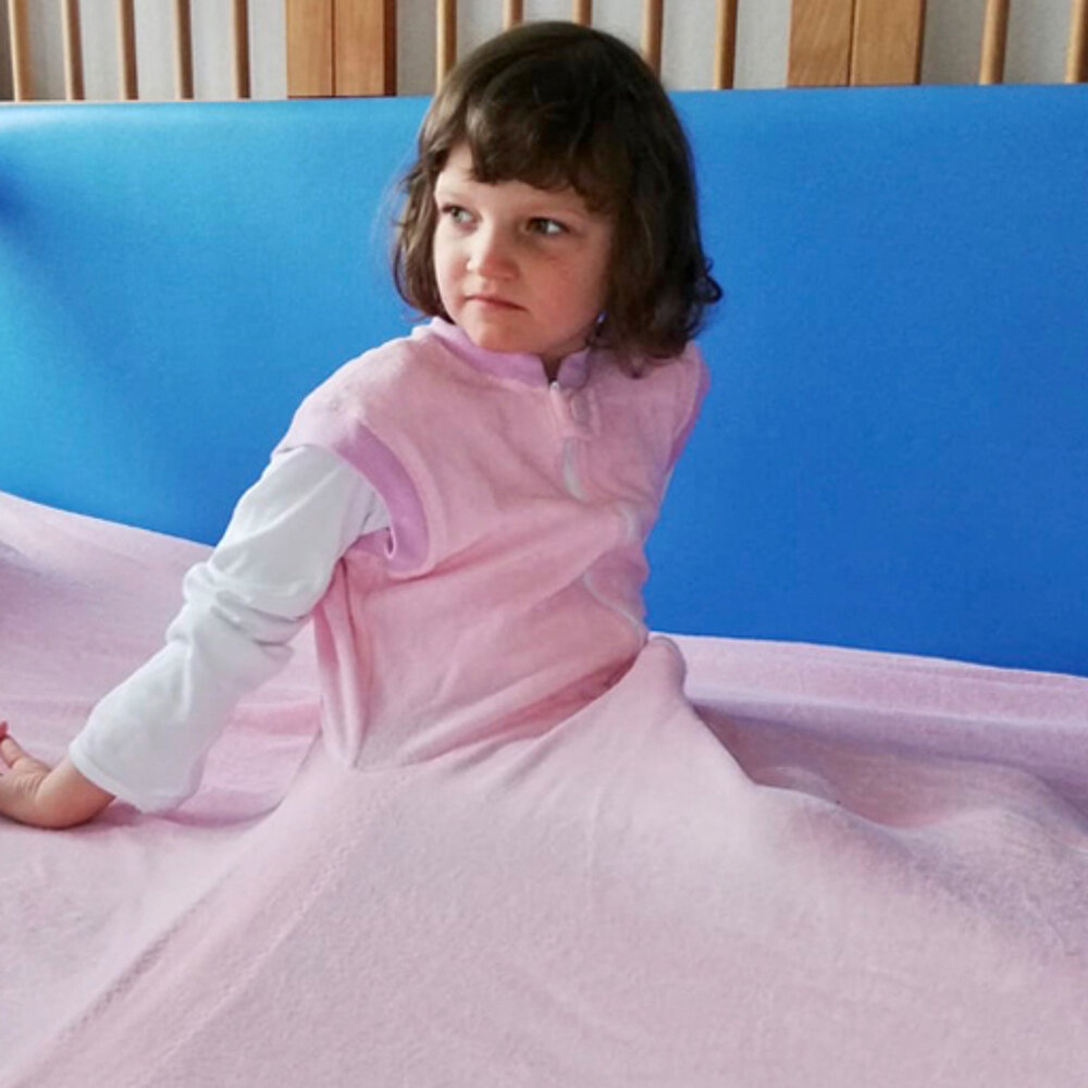 A fixed blanket is an ideal sleeping option for children with disabilities. The child slips into the fixed blanket, similar to a sleeping bag.
