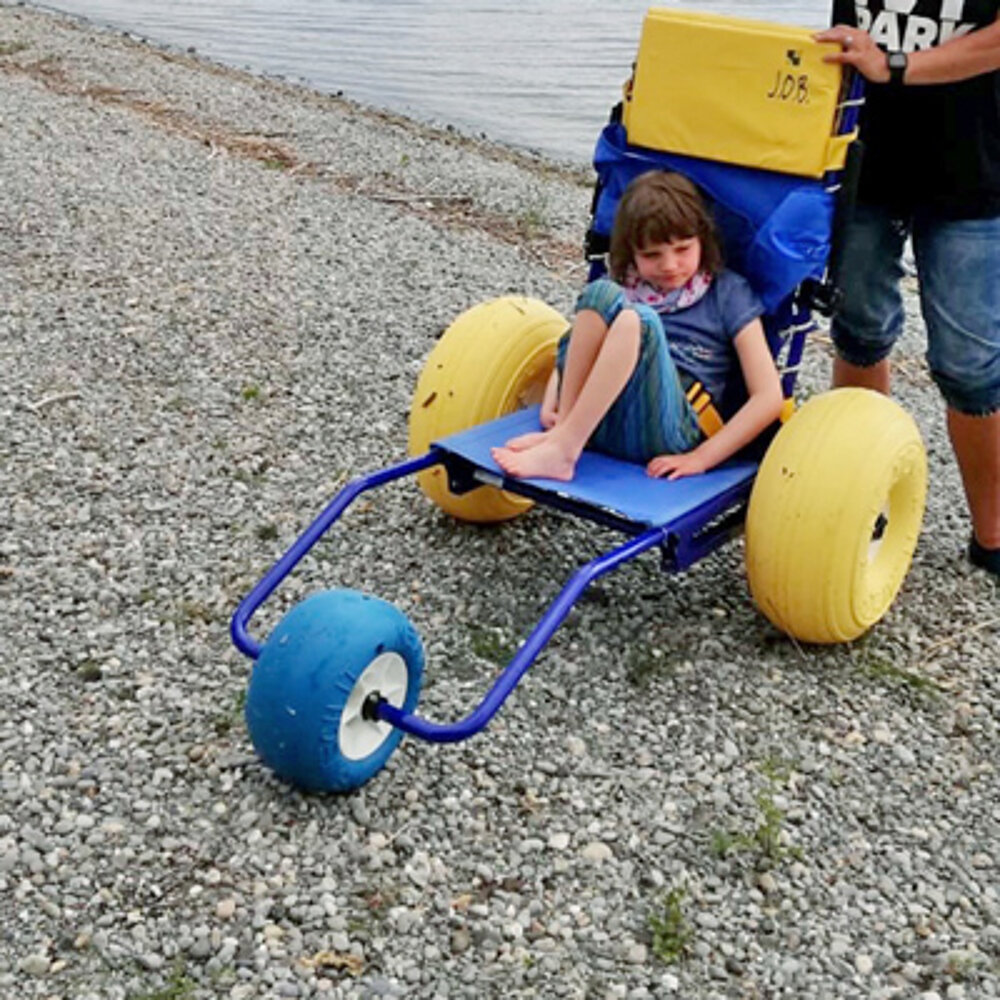 Einfach und intuitiv zusammenzustecken, leicht, allerdings relativ schwierig zu lenken, bzw.dafür muss man bei größeren Insassen kräftig sein. Im Wasser geht das alles leichter. Es gibt, falls notwendig, einen Gurt. Geht gut auch auf Kies, schwimmt im Wasser oben nachdem man aussteigt. Hat auch Fussteil, um ihn am Strand als Liegestuhl zu nutzen. Nach Gebrauch einfach zu reinigen. Kann man bei Handimove ausleihen für den Badeurlaub, was wir sehr praktisch finden.