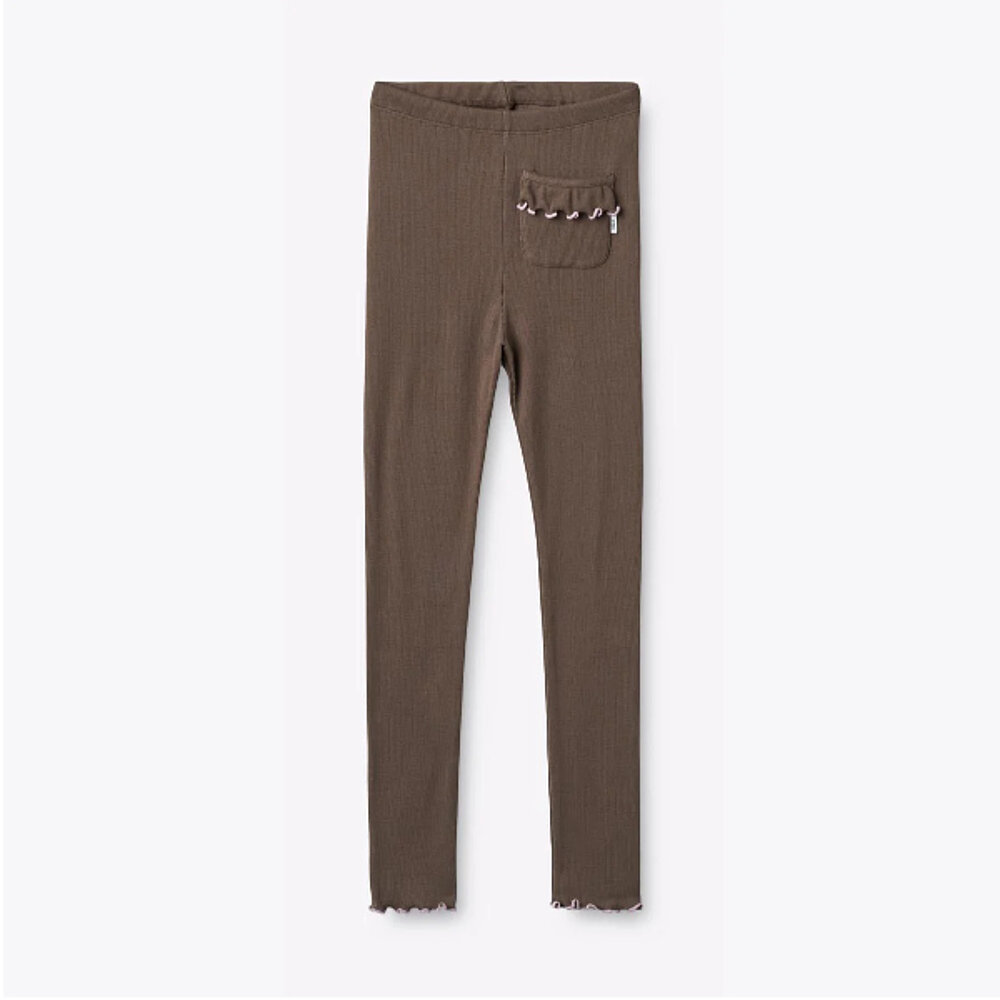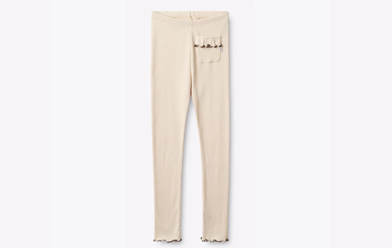 Available in two colors and made from ribbed organic cotton, they offer a soft and stretchy fit. With a practical front pocket and cheerful ruffles on the pocket and ankles, they are not only functional but also stylish.