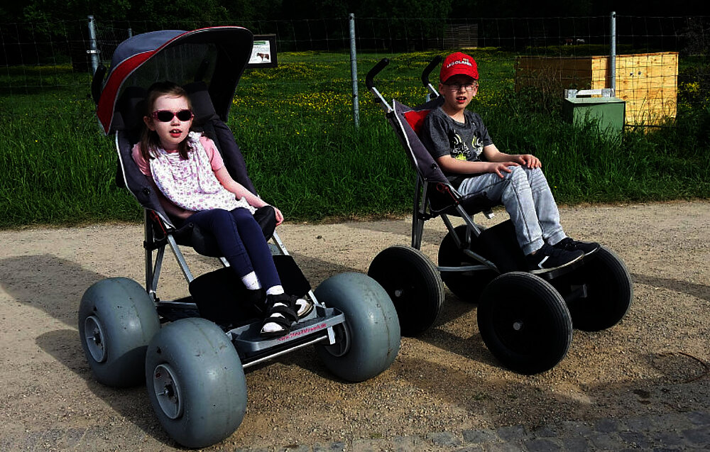 Bisher fährt unser Zugfahrzeug noch allein mit Mamas Muskelkraft, wobei da langsam eine Grenze erreicht wird und wir demnächst ein E-Bike ergänzen werden (Anhänger, Rollstuhl und Kind bringen es zusammen auf ca. 70kg, was bergauf für strammes Training sorgt).