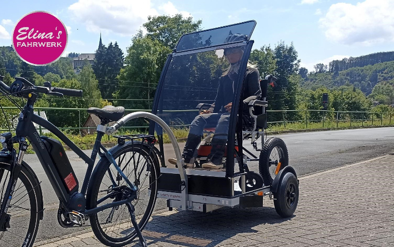 This extremely stable wheelchair bike trailer, made from lightweight aluminum, is perfect for children, teenagers, and adults—your own wheelchair is always along for the ride! With handcrafted low-loader construction in Germany, the trailer is easy to attach, load, and secure. Thanks to the robust air suspension system, it provides excellent handling and maximum safety. Available in eight sizes and nine color options, it comes equipped with safety harnesses for wheelchair securement, and optional accessories such as a grab bar, windscreen, and sunroof.