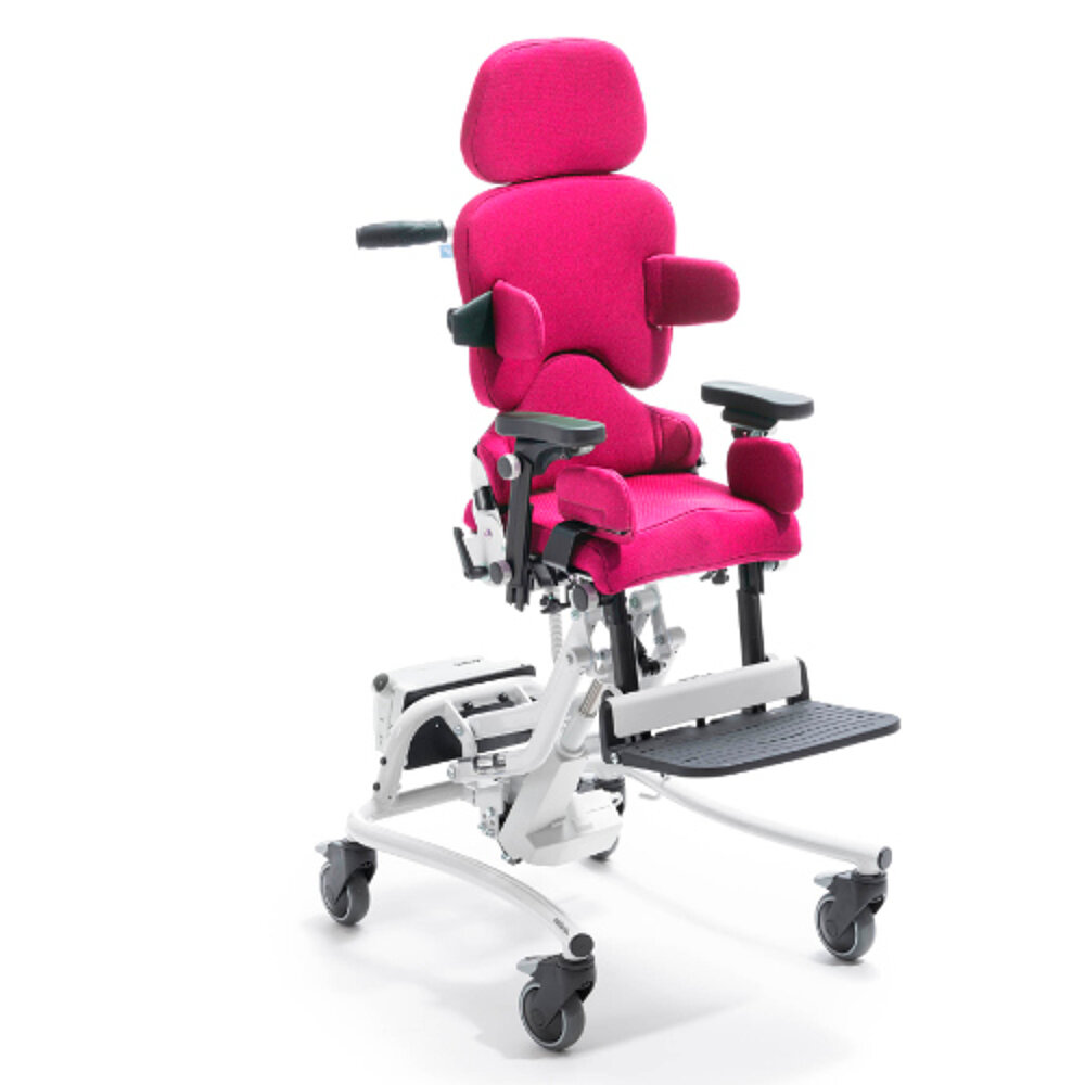 Unsre Tochter sitzt gerne in ihrem Therapiestuhl, die Kantelfunktion ist super und wird für Ruhephasen oder wenn der Kopf zu schwer wird, genutzt. Die Höhenverstellung ist super praktisch - gerade für die Kita oder beim Spielen mit der Schwester. Mit den Gummireifen kommt man gut über kleine Fliesenkanten, ohne den Stuhl anzuheben.