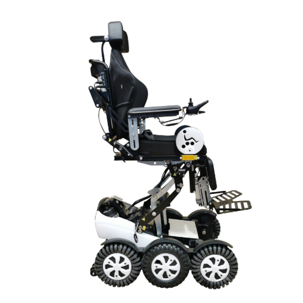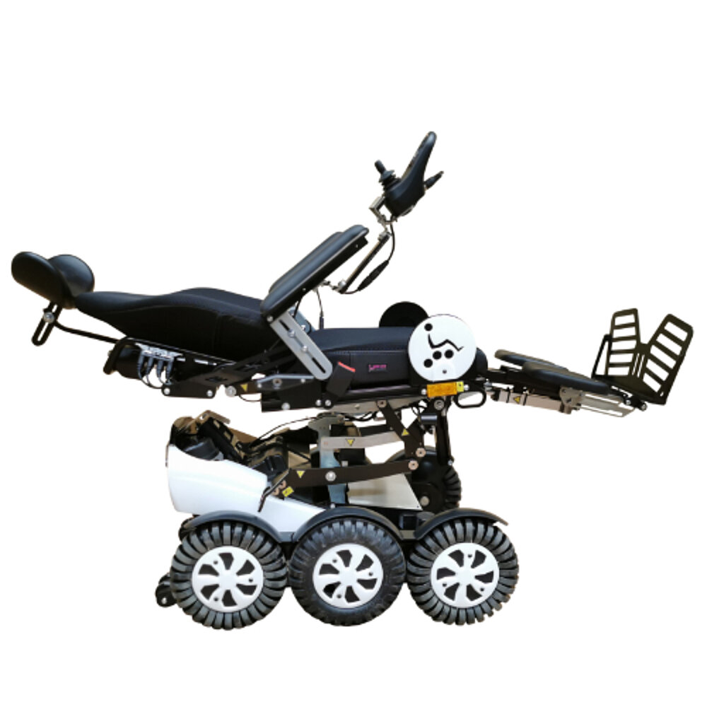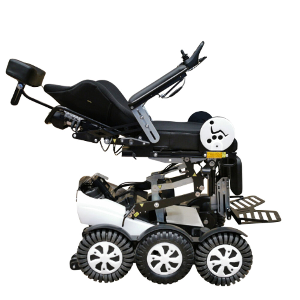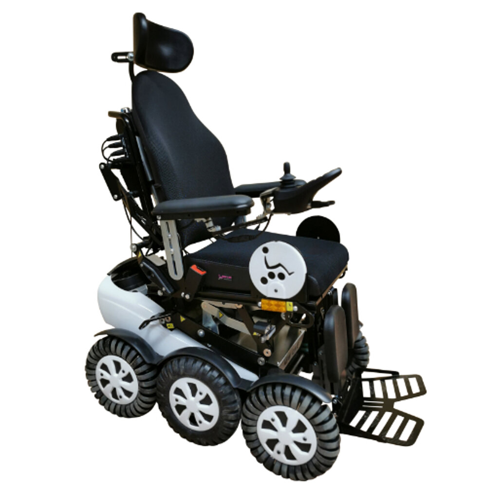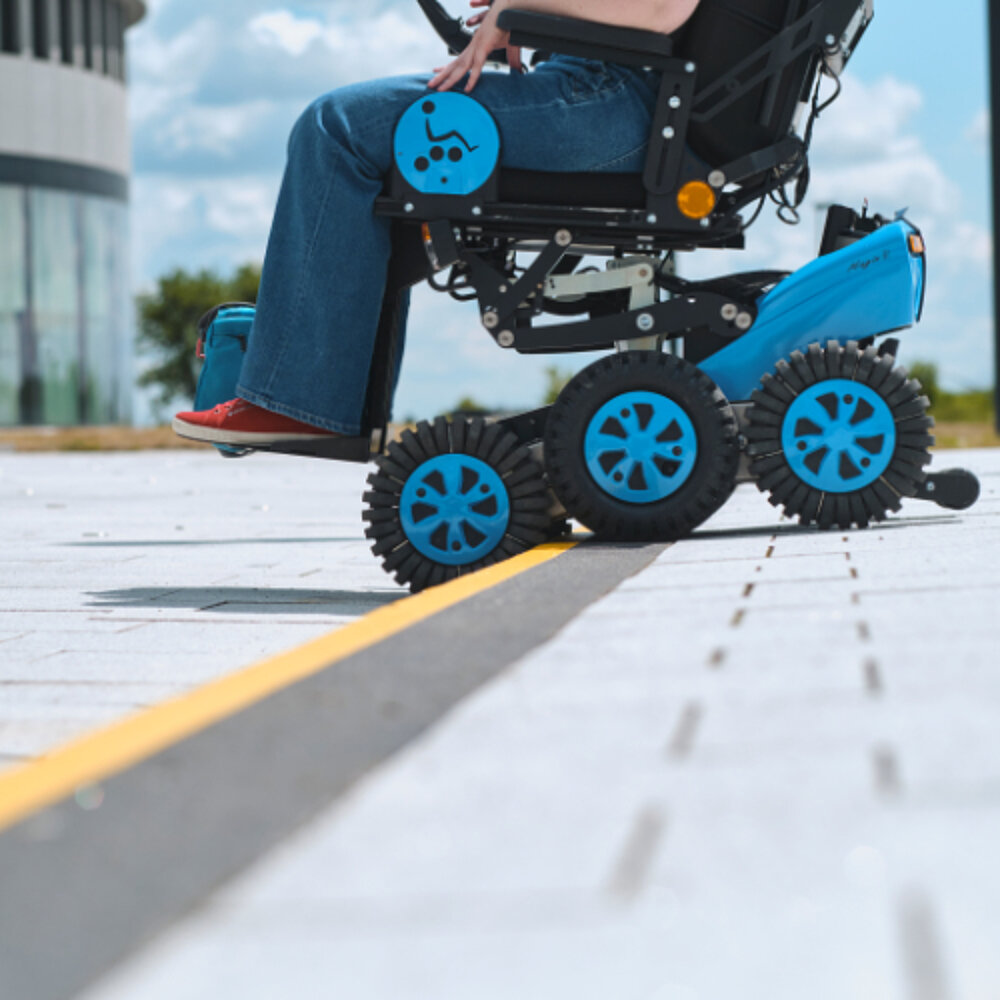 The Newlive Magix 2 power wheelchair makes it possible to safely negotiate kerbs of up to 15cm. Its innovative 6-wheel drive opens up new freedoms in everyday use; for example, it is easier to negotiate the gap when using public transport.