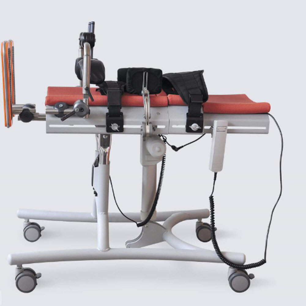 Prone/back reclining board with incline adjustment by battery or gas spring.