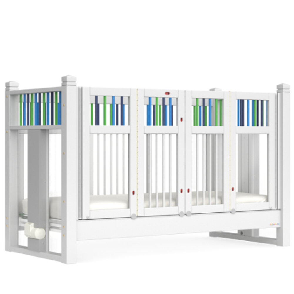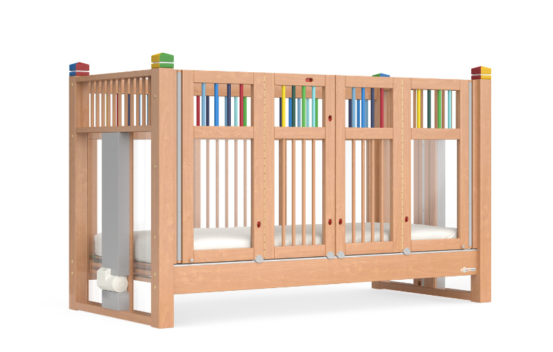 The OLAF children's care bed is specially designed for restless children with pronounced motor skills. Its exceptionally large height adjustability, ranging from 40 cm to 108 cm (optional 22 cm to 108 cm, measured from the top edge of the mattress), provides an ergonomic care height that protects the caregiver's back. The low entry height allows the child to independently get in and out of the bed. The large height adjustment range offers flexibility and enables the bed to be perfectly adapted to the individual needs of the child.