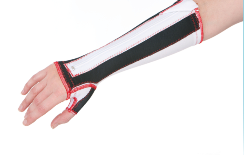 The close-fitting hand and forearm orthosis with Lycra can restrict or promote wrist extension and at the same time stabilize the thumb while it is functionally flexed and extended. If required, the S.D.O. can also encompass the fingers to improve the extension of the metacarpophalangeal joints. The functional reins and buckle are inserted and fitted according to the patient's individual needs.
