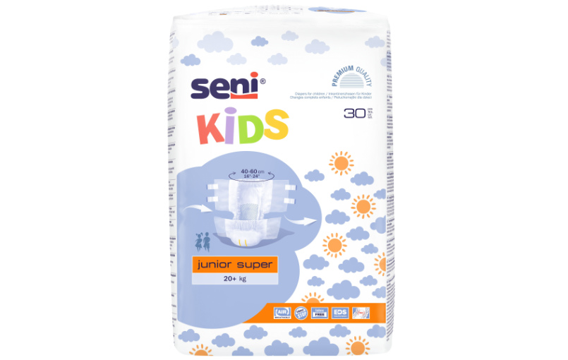 Seni Kids Junior Extra diapers are specially designed for children with incontinence who have outgrown baby diapers. They offer soft, breathable material for high comfort and side adhesive fasteners for multiple opening and closing. The strong absorbent core absorbs liquid quickly, prevents leakage and odors and provides maximum protection and security so that children can stay active.