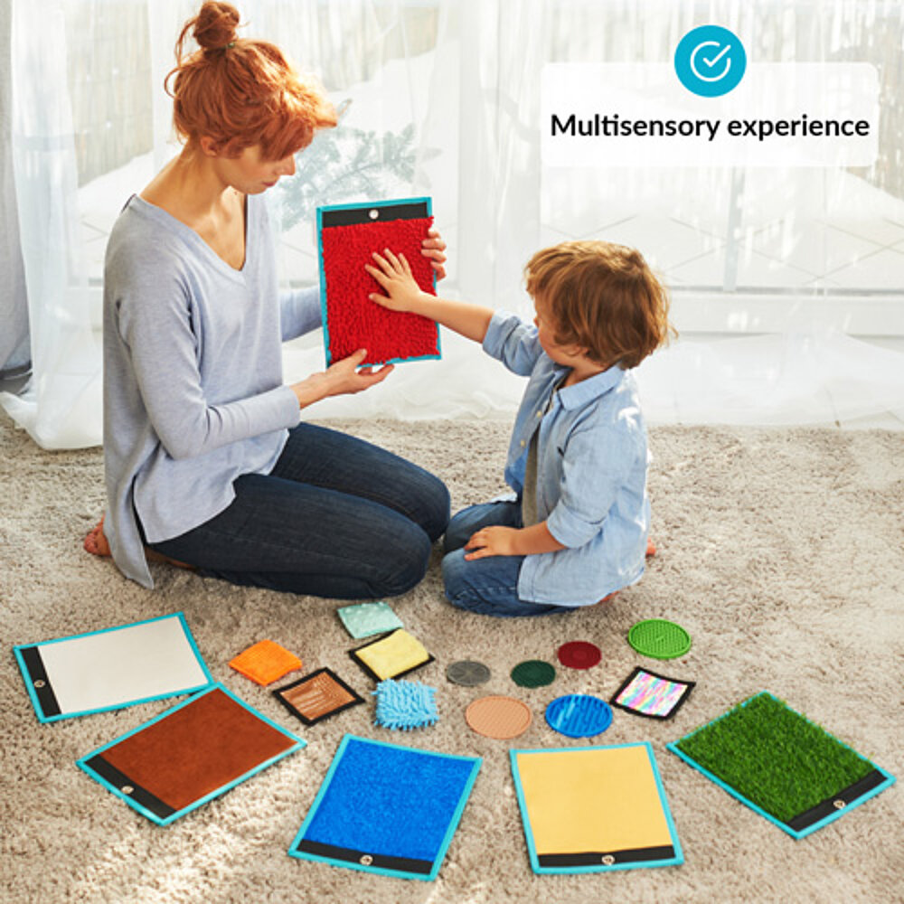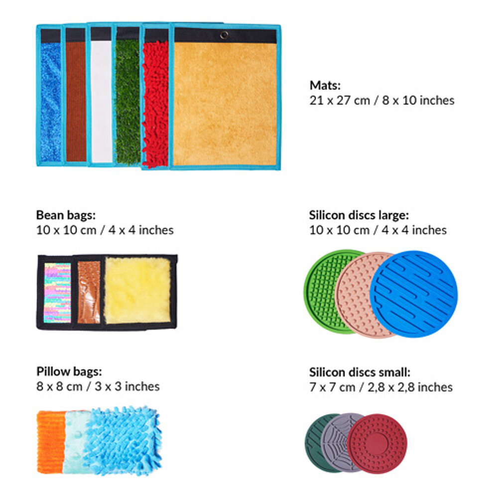 These sensory tiles provide children with a safe and interactive tactile play environment to relax and encourage concentration. Our sensory mats for autistic children are effective tools for reducing stress and aiding concentration. The sensory set makes learning fun and encourages language development, problem solving skills and fine and gross motor skills. These versatile mats, disks and bean bags can be used in a variety of settings including home, therapy sessions and classrooms and are easy to clean with a damp cloth or mild soap and water.
