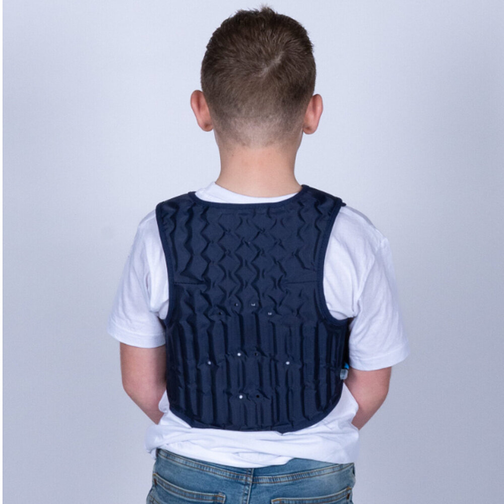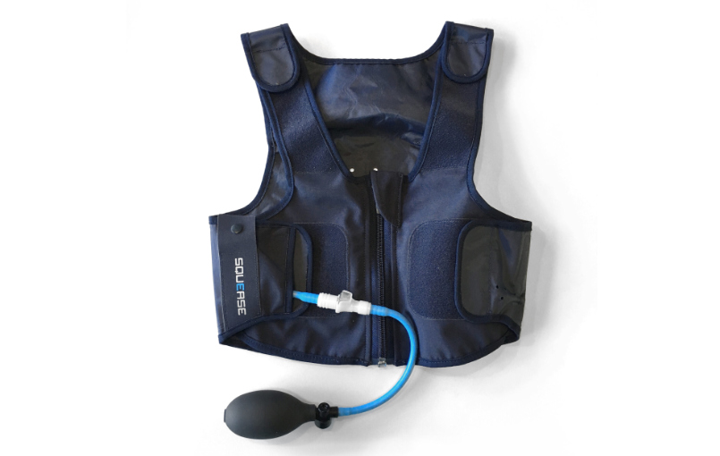 It exerts gentle pressure on the upper body - similar to a firm hug - and is equipped with a hand pump and detachable clutch.