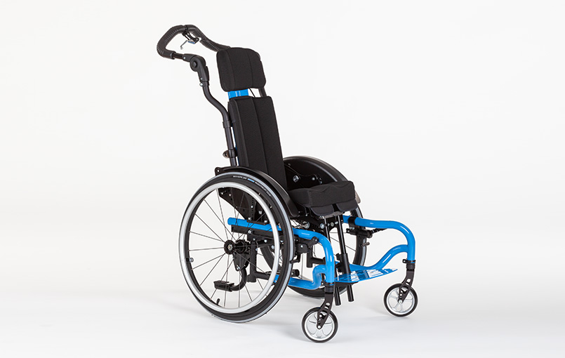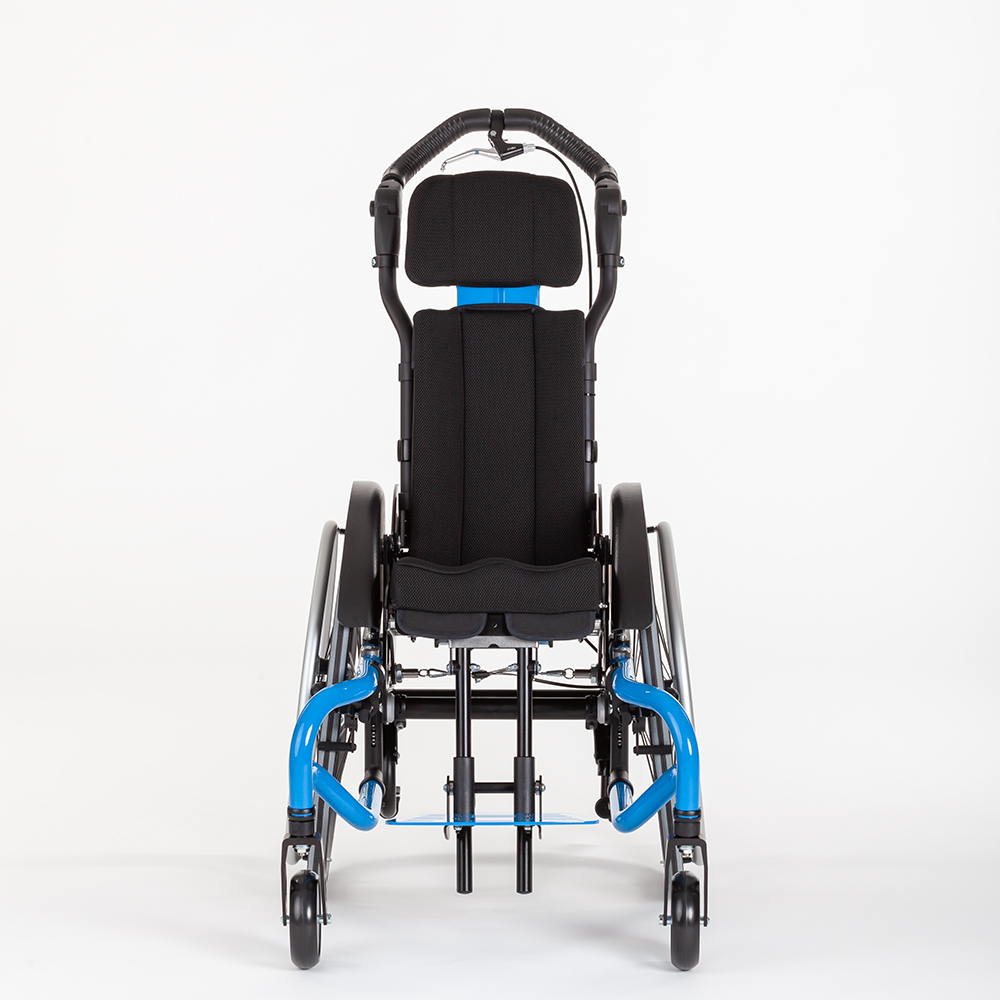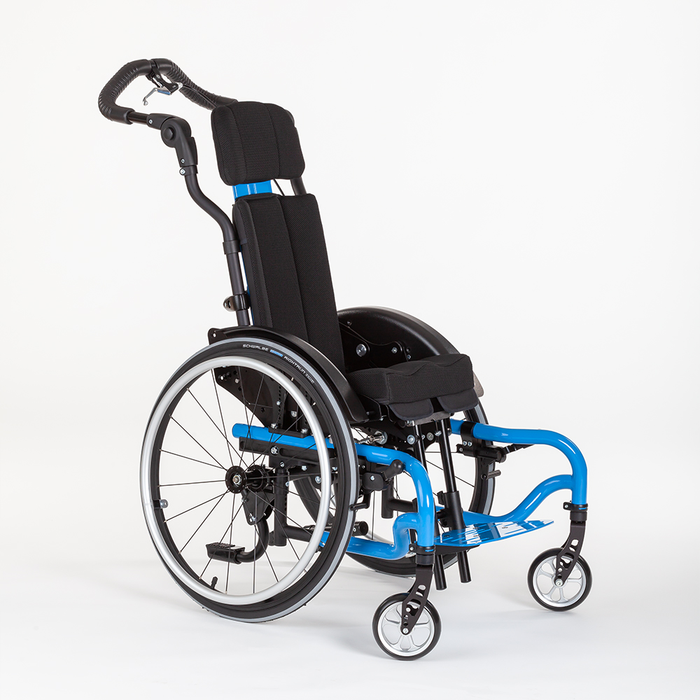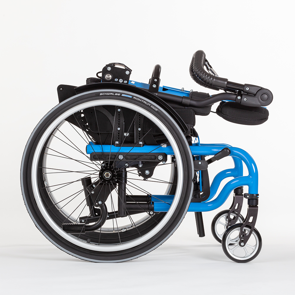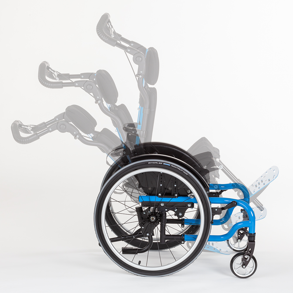 SWINGBO 2 is an active wheelchair designed for children and adolescents, featuring a 45° seat tilt. The revised seat tilt allows for a comfortable pivot at the center of gravity. The adjustable seat angle ranges from -5° to +45°. The frame is specifically designed as an abduction variant, ensuring a consistently abducted seating position.