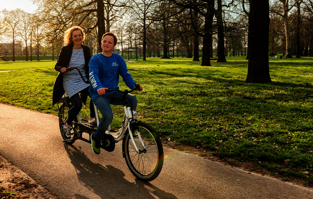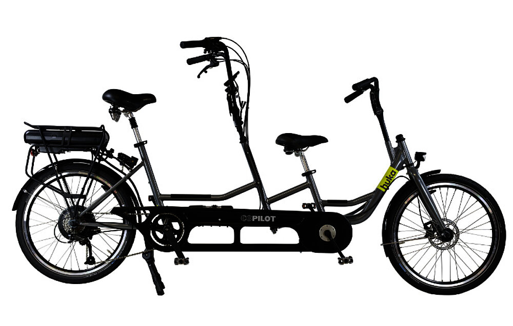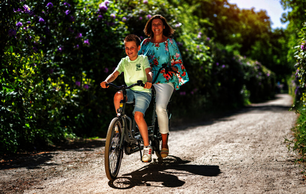 Thanks to the third wheel, both riders can sit comfortably, even when stationary. Mounting and dismounting are easy due to the high stability. The front part can be folded down to provide more space for mounting and dismounting. The pilot takes control of the steering, while the passenger has handlebars to hold onto. The pilot can engage the optional freewheel, allowing the passenger to pedal. With the regular freewheel, the passenger can choose whether to pedal or not. It's a tandem that enables joint cycling without safety concerns.