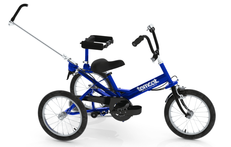 The Fizz is the tricycle on which the Tomcat brand was built. It was the world's first tricycle designed for individuals with disabilities, featuring Carer Control™ (enabling steering and braking control when needed), a lightweight two-part frame (for easy transport and storage), Trailer-Trike™ adaptation (for family cycling), Dual Axle™ (a switchable axle for training or sudden emergencies), and a Swivel Saddle™ (for easier access).