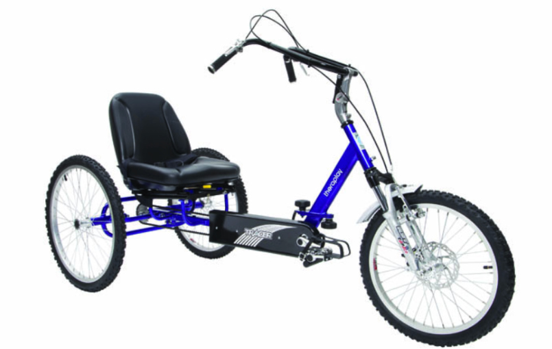 TRACER - Tricycle for taller, active riders with a low center of gravity for excellent stability and a relaxed seating position for more comfort and safety while riding. Semi-reclined seating position, comfortable and stylish oval tube frame, folding/separating mechanism for transportation and storage. Pedals in front of the seat with self-balancing function and toe clips, seat adjustable on rails and removable for transportation. Front fork with suspension, disc and V-brakes, EZ-Access handlebar stem adjustable for arm reach and easy entry, two brake levers, one with parking function. Various drive options: Rigid gear, freewheel, Option Drive or new 5-speed hub gear. Suitable for teenagers and adults.