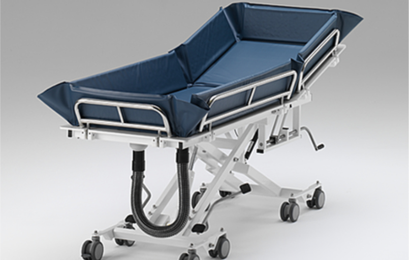 The UDW 2500 VRW is a stainless steel shower bed suitable for individuals with heights ranging from 185 to 200 cm and a weight capacity of up to 200 kg. Features include continuously adjustable backrest, padded tub for enhanced comfort, foldable foot and side supports, collapsible headrest, and continuous hydraulic height adjustment from 49 - 89 cm via dual-sided foot pedals. Additional functions comprise the anti-/Trendelenburg position using gas spring, a lockable and controllable drain with a 90 cm long hose, easy cleaning and disinfection, a powder-coated stainless steel frame (guaranteed rust-resistant), high stability, and 8 swiveling Ø 100 mm plastic-stainless steel double-wheel casters (4 with brakes) for smooth and maneuverable transport.