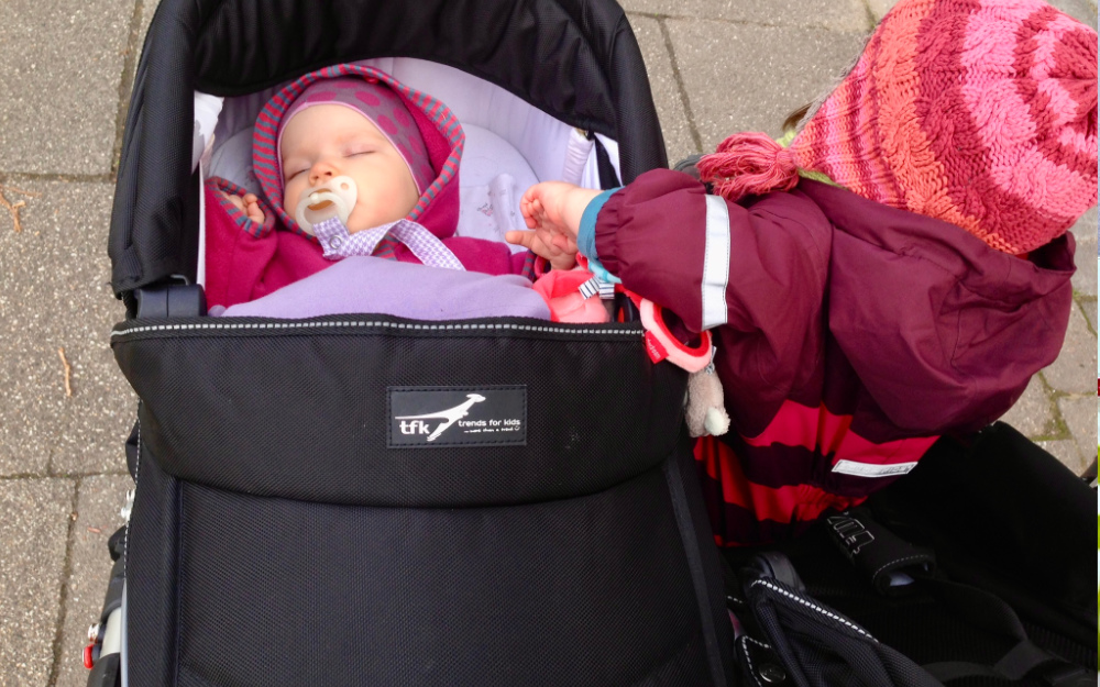 Put the baby in the carrier first, a sibling pushchair for longer walks. For hypotonic children, the Goto can also be placed in the sibling pushchair, for example.
